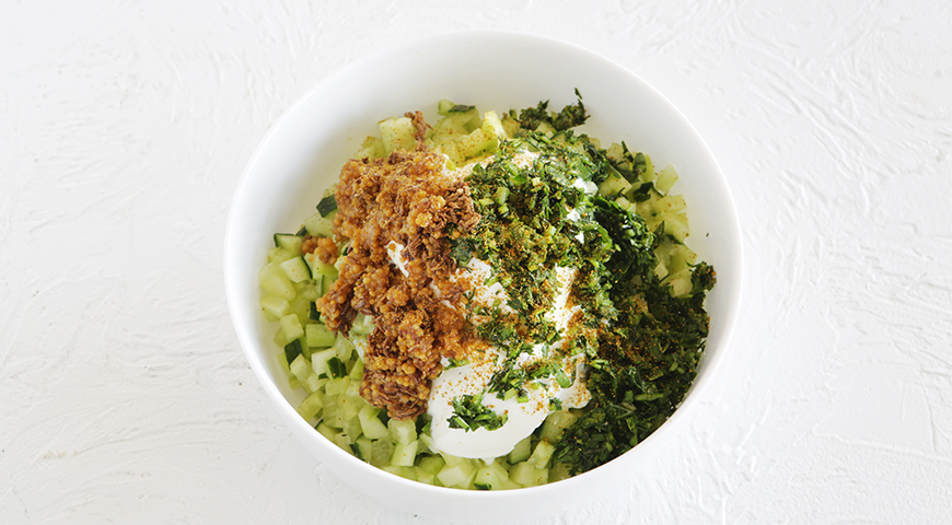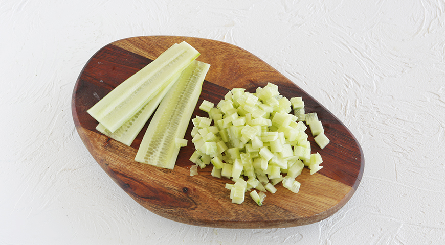 - По желанию очистите огурцы (или оставьте с кожицей, если она тонкая) и очень мелко нарежьте. Измельчите зелень тяжелым ножом буквально в пасту (подсыпьте немного соли, чтобы это было попроще).