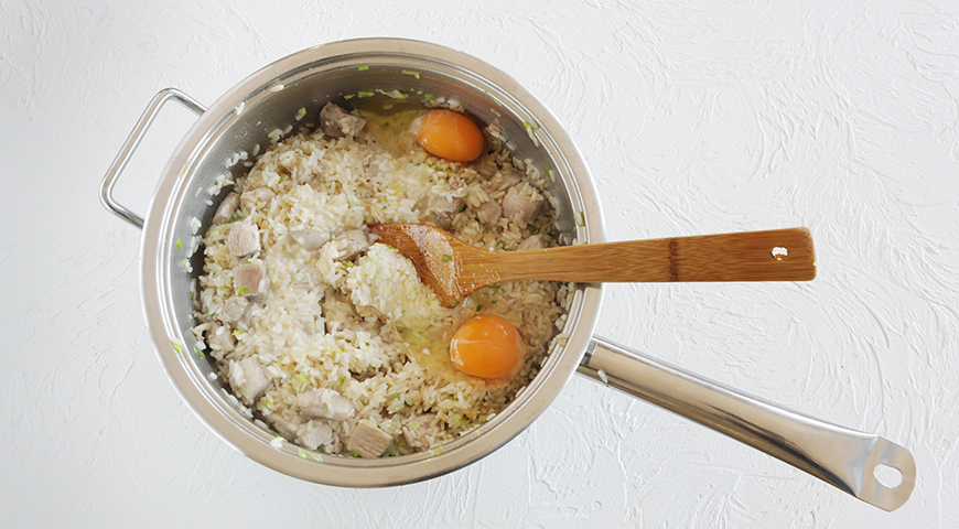 Шаг 4 - Прямо в рис разбейте яйца, посолите, посыпьте зеленым луком и обжаривайте на сильном огне, постоянно перемешивая, чтобы яйца равномерно распределились и прожарились, 3 мин. Подавайте немедленно, с совевым соусом.