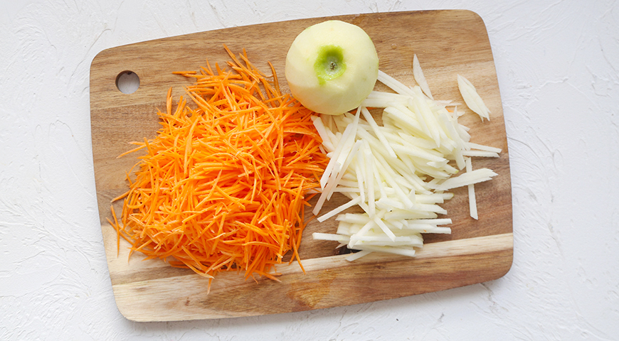 - Очистите морковь и нарежьте тонкой соломкой, примерно 2х2х10 мм. Яблоки очистите от кожуры, удалите сердцевину, мякоть нарежьте так же как морковь.