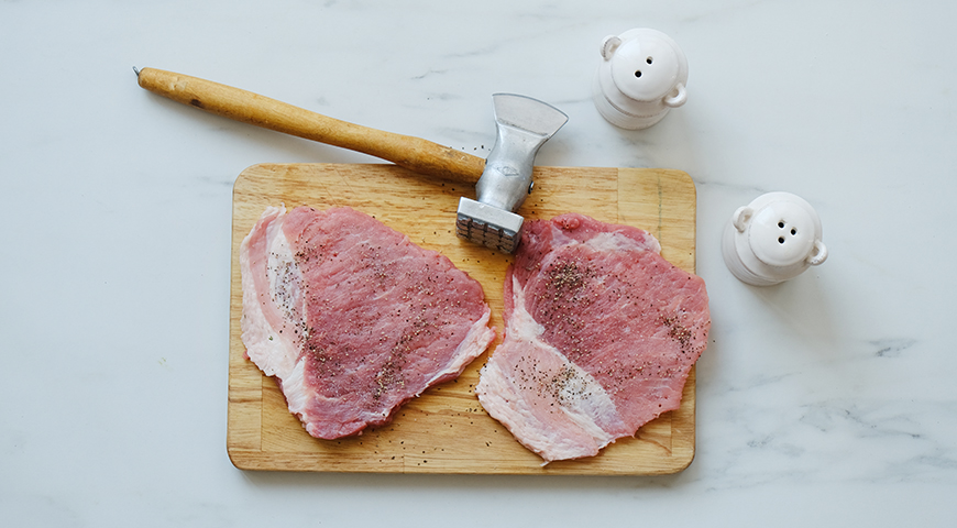 - Очень острым ножом разрежьте кусок свинины поперек волокон на 4 равных куска. Слегка отбейте их между 2 листами пергамента при помощи скалки, пестика или просто кулаком. Посолите мясо с обеих сторон, поперчите и дайте полежать под пергаментом 10–15 мин.