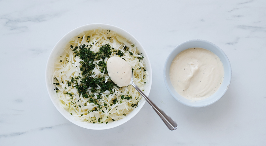 - Тонко нашинкуйте капусту, затем разрежьте поперек на 3 части. Очень мелко порубите укроп, удаляя жесткий низ стеблей. Слегка посолите и смешайте укроп и капусту.