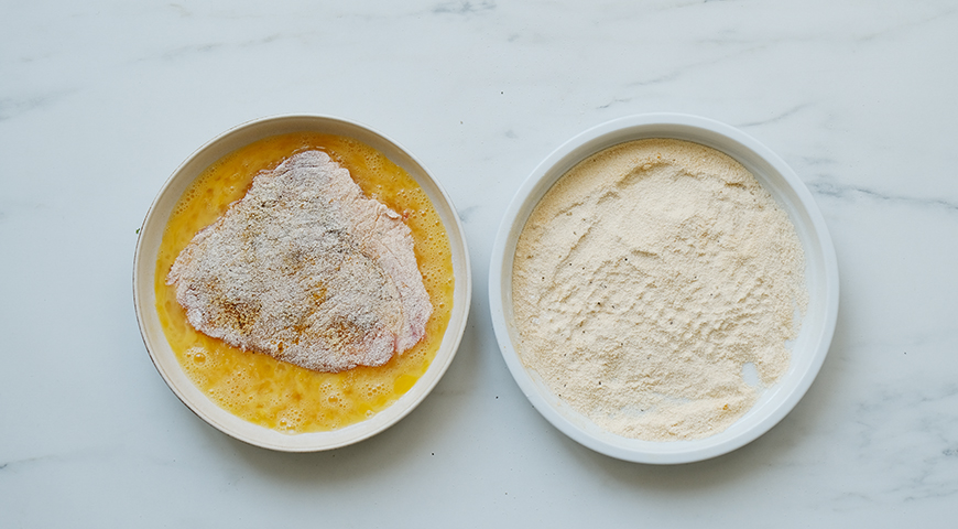 - Насыпьте муку в глубокую тарелку. Окунайте кусок свинины сначала в муку и обваливайте со всех сторон. Стряхивайте лишнее. Затем окунайте в яйцо так, чтобы яичная смесь также покрыла отбивную со всех сторон.