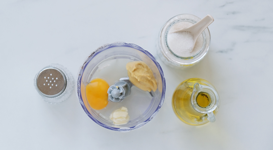 Шаг 1 - Для чесночного майонеза яйцо комнатной температуры разбейте в стакан погружного блендера. Добавьте раздавленный и очищенный чеснок, 7 г соли, сахар, горчицу и уксус. Влейте 100 мл растительного масла и взбейте до однородности.