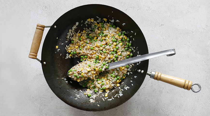 Шаг 2 - Добавьте горошек и кукурузу, продолжайте обжаривать, перемешивая, еще примерно 3 мин. Подавайте немедленно, с соевым соусом.