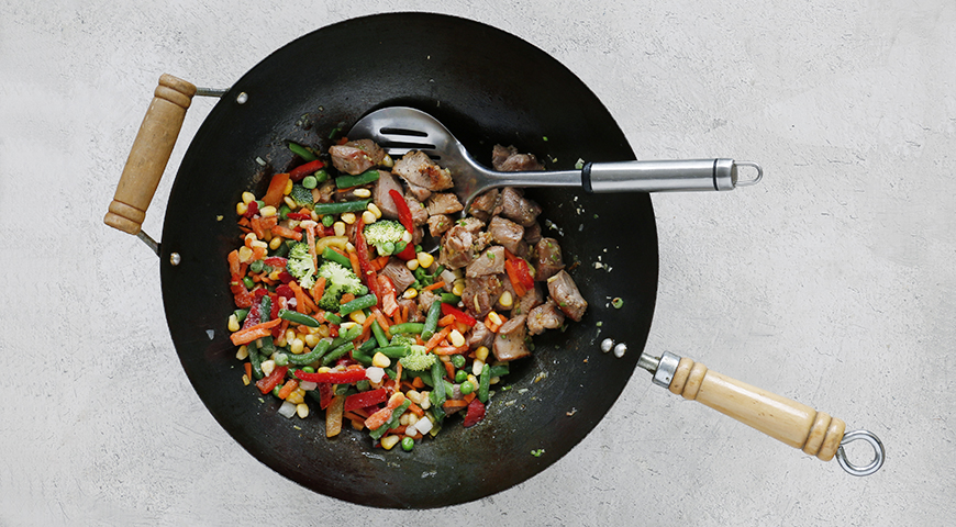Технология приготовления мяса с овощами может быть очень разной – от долгого томления до мгновенного обжаривания. Это блюдо делается последним способом, и будет готово очень быстро. Для ускорения процесса можно обойтись без сухого маринования, просто посолите-поперчите мясо и жарьте! Если у вас дома есть вок – готовьте в нем, в воках нагревается не только дно, но и стенки, что увеличивает скорость и качество обжаривания. Вместо бедра индейки можно использовать куриное бедро или грудку.