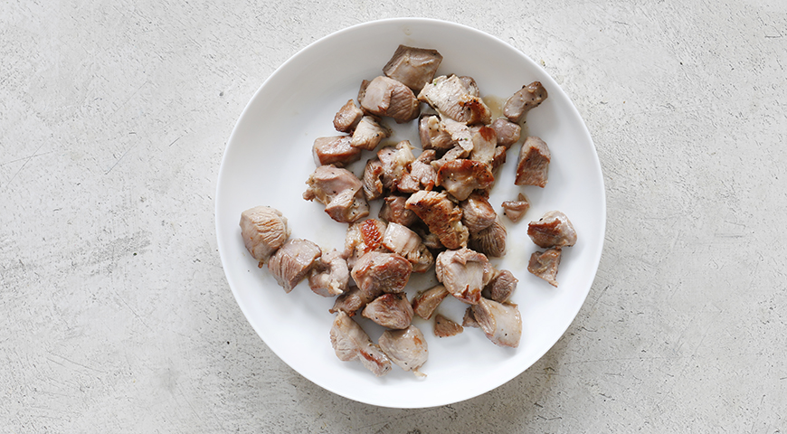 Шаг 2 - В воке или большой сковороде нагрейте масло, обжарьте кусочки индейки на максимальном огне небольшими партиями до румяной корочки. Готовую индейку выкладывайте на тарелку.
