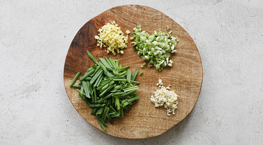 Шаг 1 - Очистите и мелко порубите чеснок, мелко покрошите имбирь. Тонко нарежьте белую часть зеленого лука. Зеленую часть нарежьте слегка наискосок кусочками длиной 2–2,5 см.
