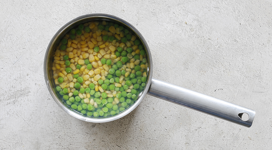 - Залейте горошек и кукурузу холодной водой, доведите на сильном огне до кипения, уменьшите огонь, варите 2–3 мин., затем откиньте на дуршлаг.