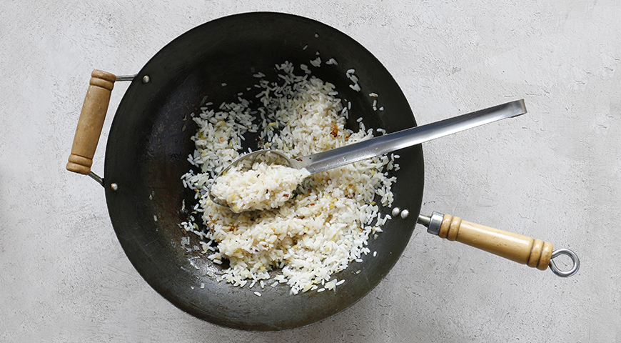 Шаг 1 - Очистите и измельчите лук и имбирь. В воке или большой сковороде обжарьте лук с имбирем в масле, 2 мин. Добавьте рис, перемешайте и прогревайте на сильном огне, все время перемешивая, 2 мин.