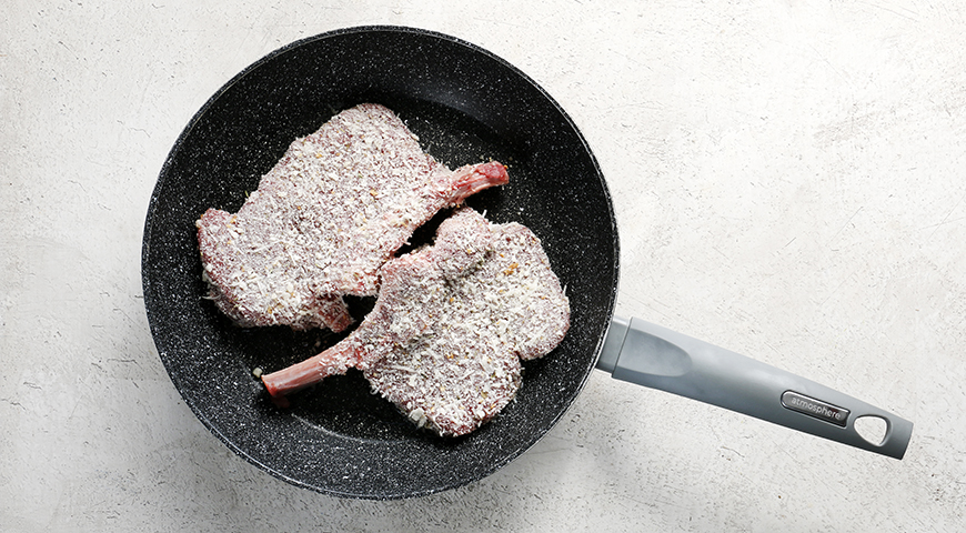 «Чаще всего отбивные котлеты по-милански готовят не просто в панировке, а обмакнув предварительно в муку, потом в яйцо и только потом в сухари. Я очень не люблю толстый слой получающегося в результате «теста», который сильно портит мне вкус мяса. Попробуйте отбить мясо так, как описано в рецепте, чтобы крошки панировки сами прилипли к поверхности».
