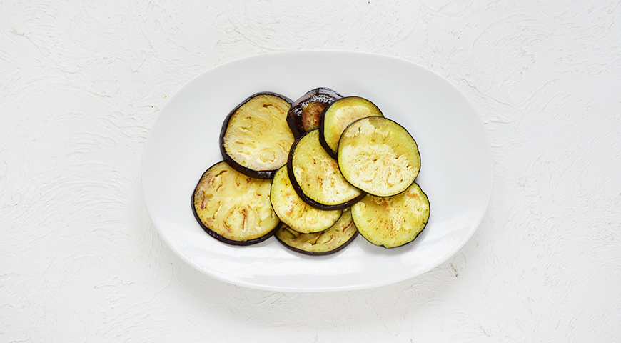 - Баклажаны нарежьте кружками толщиной максимум 0,5 см и обжарьте на большой сухой сковороде на среднем огне до легкой корочки. Готовые баклажаны выкладывайте на тарелку.