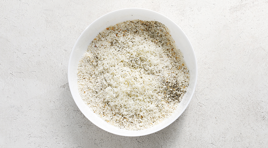 Шаг 3 - Добавьте в остывшую панировочную смесь пармезан, перец и соль.