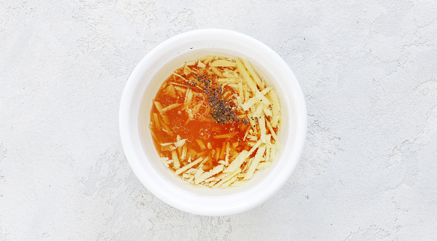 Шаг 1 - Имбирь очистите и очень тонко нарежьте, смешайте с маслом, оставшимся уксусом и медом, поперчите, заправьте капусту.
