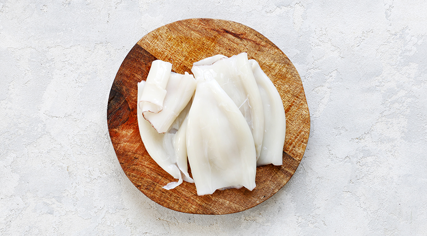 - Поставьте закипать полный чайник воды. У кальмара удалите тонюсенькую пленочку с обеих сторон филе, поддевая ее пальцами.