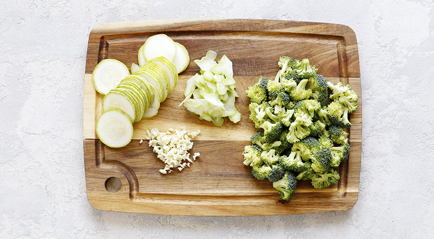 Шаг 2 - Чеснок раздавите, очистите и измельчите. Стебель брокколи очистите и нарежьте тонкими кружками, кочанчик разделите на соцветия. Кабачок нарежьте кусочками 2 см.