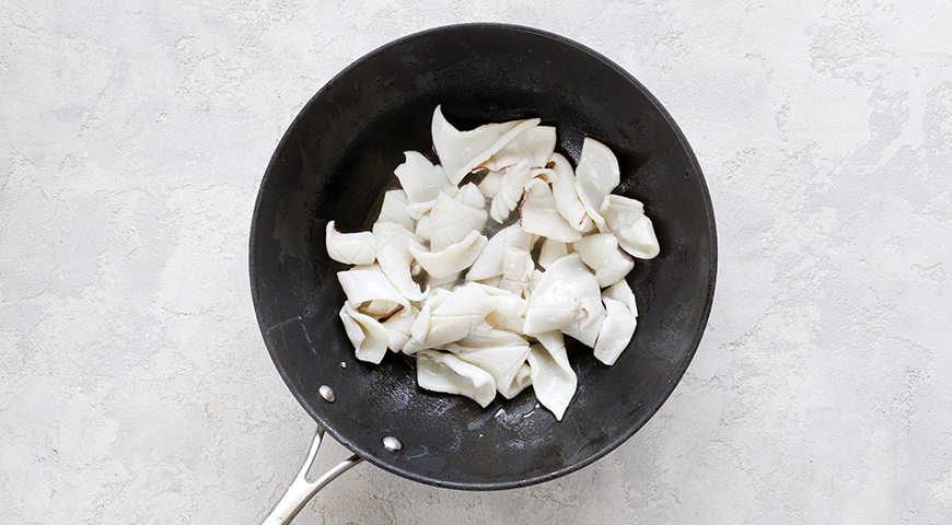 Шаг 3 - В воке или большой сковороде с толстым дном нагрейте масло с чесноком, на сильном огне обжарьте кальмары, не дольше 30 сек. Выньте кальмары шумовкой на тарелку.