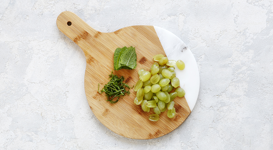 Шаг 2 - Виноград отделите с веточек, разрежьте ягоды пополам. У мяты удалите стебли. Листочки мяты сложите стопочкой, сверните в трубочку и тонко нашинкуйте.