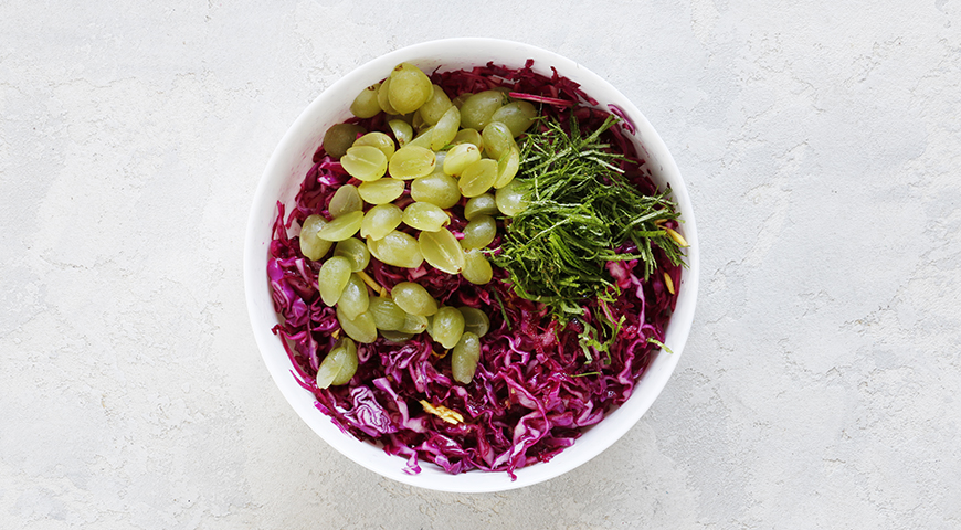Шаг 3 - Смешайте капусту с виноградом и мятой, дайте настояться 5–10 мин. и подавайте.