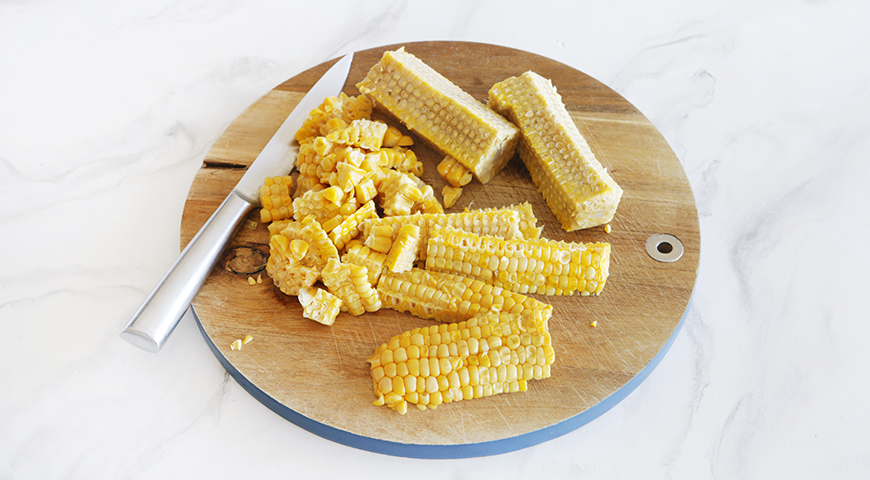 - Положите очищенные початки кукурузы в кастрюлю с холодной водой, закройте крышкой. На сильном огне доведите до кипения, варите 7 мин. Не солите! Остудите початки и острым ножом срежьте зерна.