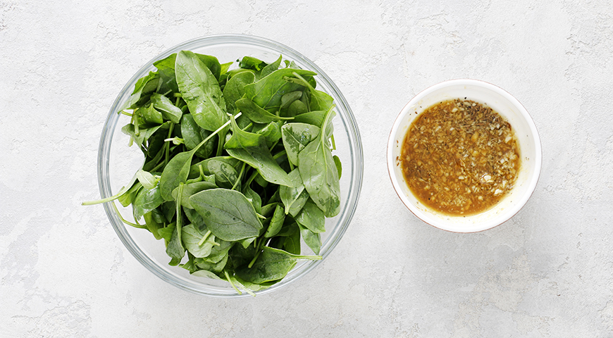 Шаг 2 - Выложите шпинат к теплой заправке, перемешайте.