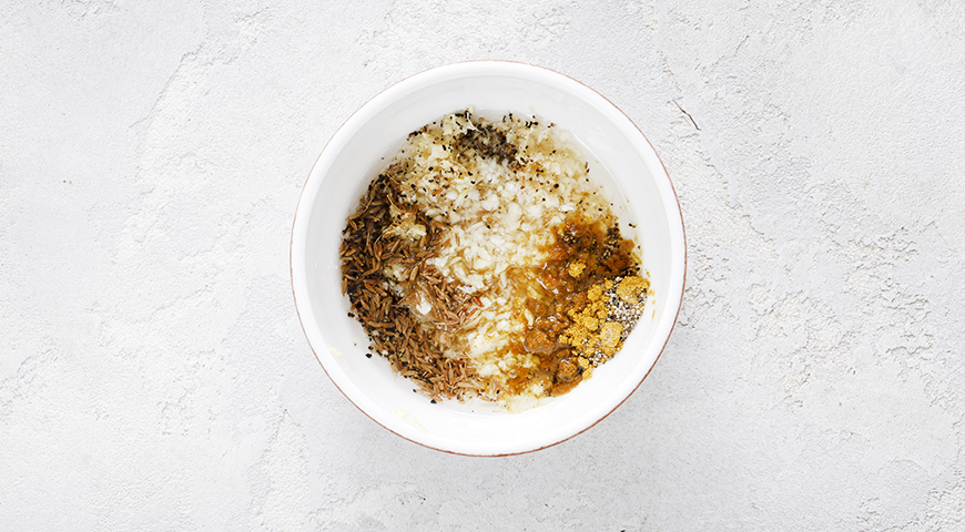 - Для заправки очистите чеснок и имбирь, порубите как можно мельче, сложите в жаропрочную миску, посолите, поперчите, добавьте зиру и карри, тщательно перемешайте.