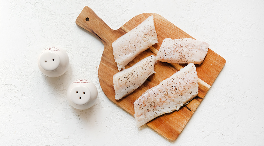 Шаг 1 - Рыбу разрежьте на 4 равных куска, посолите и поперчите со всех сторон.