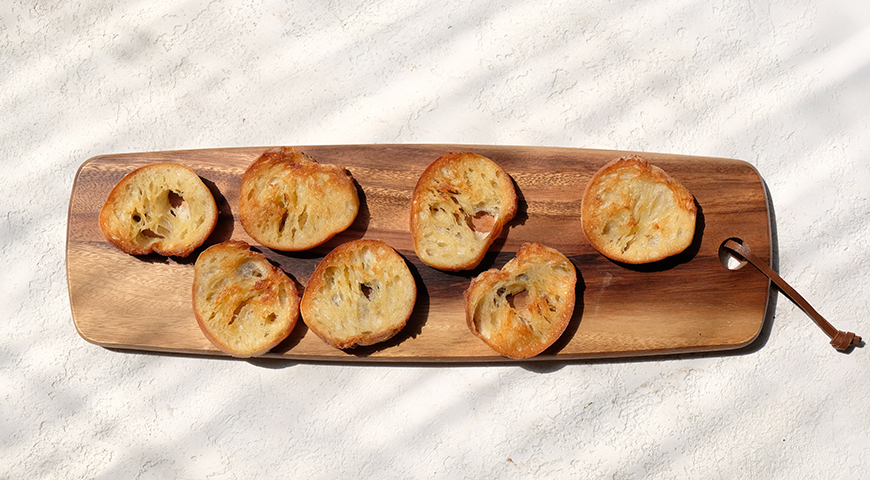 Шаг 4 - Нарежьте хлеб толстенькими ломтиками, 1,5–2 см. Слегка смажьте куски хлеба с одной стороны маслом и обжарьте этой стороной вниз на сковородке до румяной корочки. Со второй стороны не жарьте!
