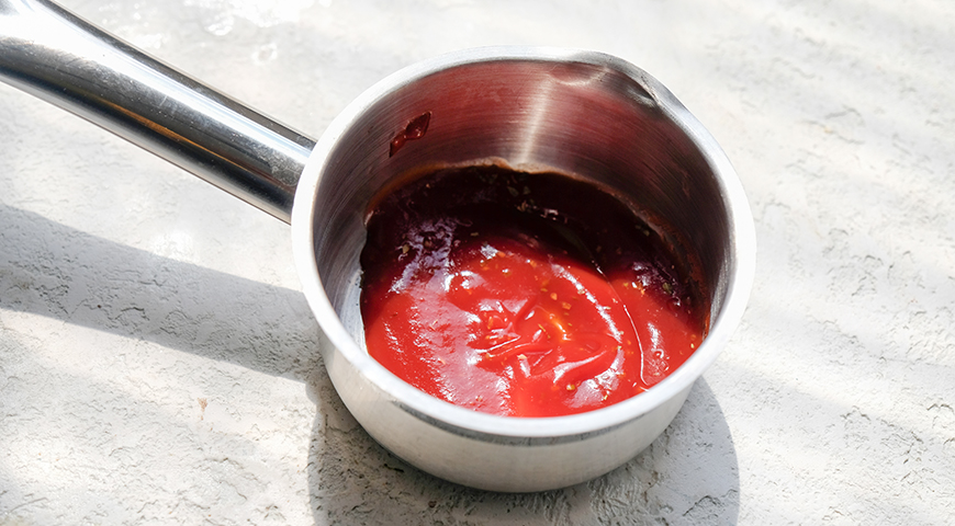 - Выпарите из томатного соуса жидкость на сковородке на среднем огне наполовину, 2–3 мин. Остудите.