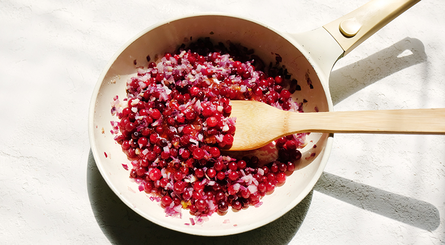 - Для соуса очистите и измельчите лук и чеснок, обжарьте в масле до мягкости, 5 мин. Добавьте бруснику и сладкий соус чили, прогрейте 3–4 мин. Затем измельчите блендером.
