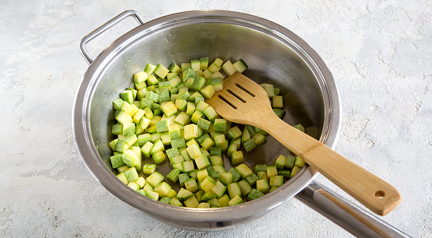 Шаг 2 - Положите кабачки в раскаленное масло и, все время перемешивая, обжарьте до румяной корочки, 3 мин.