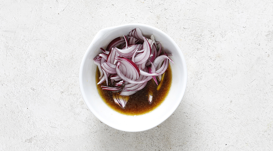 - Лук очистите, нарежьте средними перьями. Приготовьте заправку, смешав горчицу, уксус бальзамический, мед и масло растительное до однородной эмульсии, добавив соли и перца, Положите лук в заправку и перемешайте.