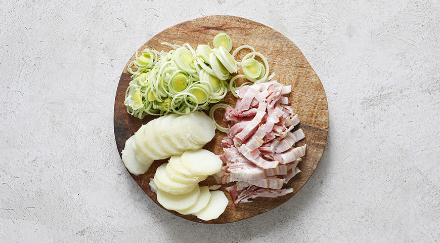 Шаг 1 - Нарежьте картофель кружочками. Тонко нарежьте лук. Мелко нарежьте бекон.