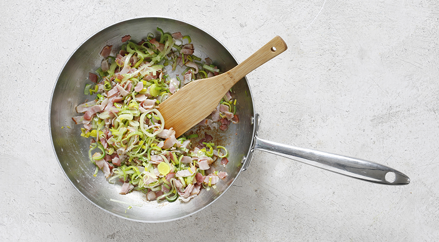 Шаг 2 - Обжарьте бекон с луком и оливковым маслом, 5 мин., посолите и поперчите.