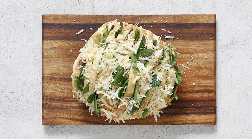 Шаг 3 - «Нафаршируйте» хлеб картофелем и луком с беконом (используйте все масло из сковороды). Добавьте листья шпината. Засыпьте сыром. Заверните в пергамент, затем в фольгу.