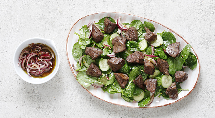 Куриная печенка – продукт, к которому редко относятся нейтрально. Она либо нравится, либо совсем нет. И вот последний случай очень часто связан с тем, как человеку эту печенку раньше готовили. Дело в том, что печень любого животного – продукт капризный. Если ее сильно недожарить, она сохраняет характерный запах и текстуру сырого мяса, которые многим не нравятся. Но еще хуже, если ее пережарить. Тогда она становится сухой и крупитчатой, а вкус как будто теряется. Зато если поджарить куриную, утиную или индюшиную печенку правильно – то есть снять с огня, пока она еще чуть пружинит при нажатии пальцем, а на разрезе в центре отчетливо розовая, то за несколько минут на тарелке она «доготовит» сама себя и будет идеально нежной. В салате в сочетании с хрустящими огурчиками, сладким луком и кисло-сладкой горчичной заправкой получится просто великолепно.