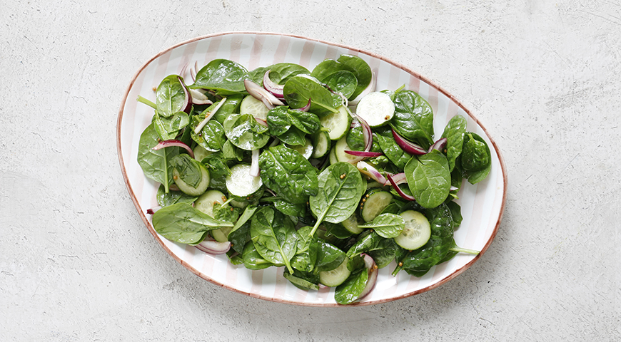 Шаг 2 - Тонкими кружочками нарежьте огурцы, слегка посолите. Смешайте огурцы, шпинат и 1 ст. л. лука с заправкой (это лучше делать руками), разложите по тарелкам.