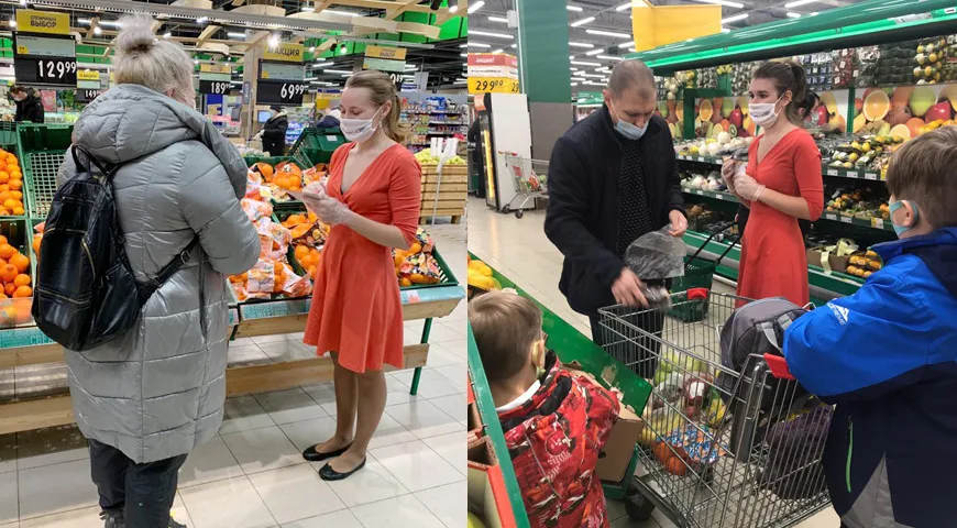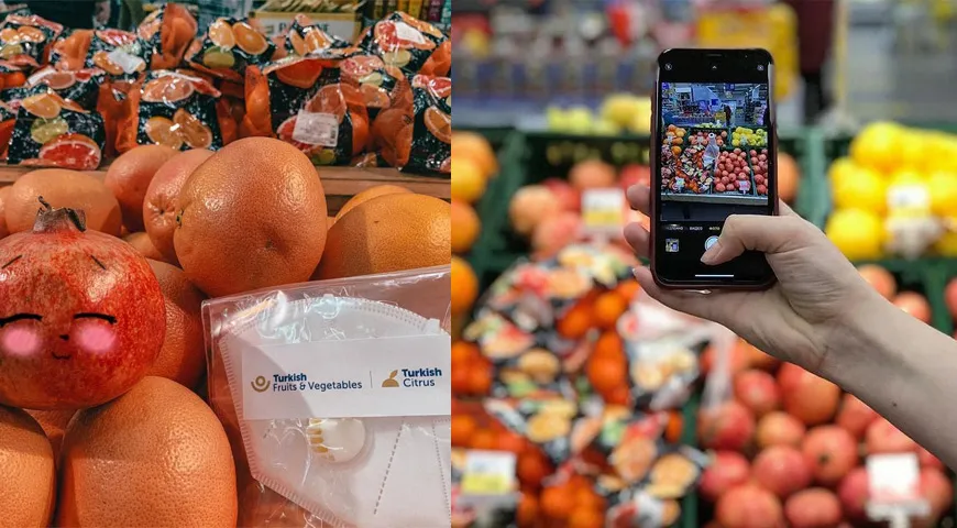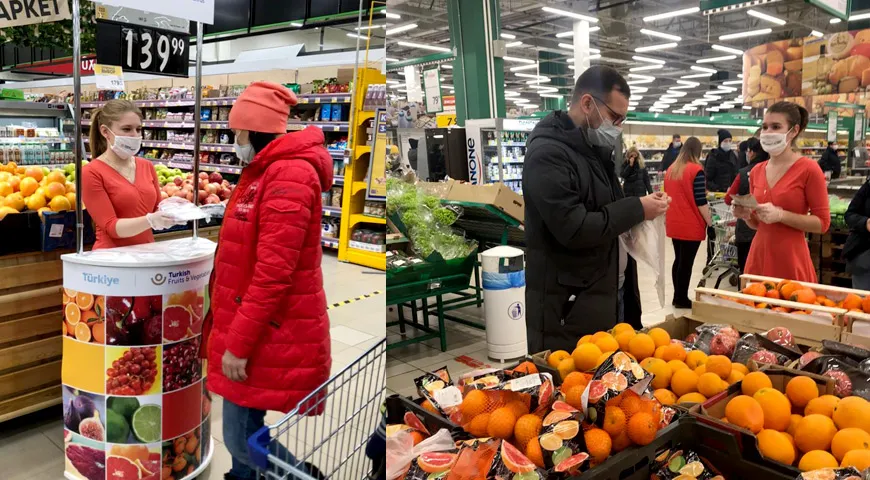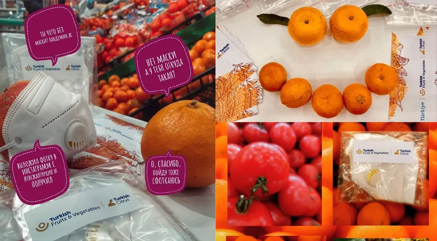 Девушки-промоутоеры в ярких оранжевых платьях рассказали покупателям много интересного о замечательных о свежих турецких овощах и фруктах. Покупатели отвечали на три коротких вопроса анкеты, выкладывали интересные фотографии с мандаринами, помидорами, апельсинами, лимонами, грейпфрутами, виноградом, инжиром, гранатами и черешней в социальных сетях и получали в подарок многоразовую защитную маску в специальном брендированном пакетике для хранения защитных масок.