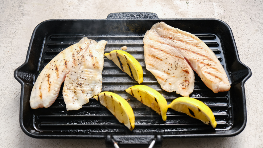 - У тилапии от «головы» по центру вырежьте длинную треугольную полоску с остатками мелких косточек – никак иначе их не удалишь. Приправьте рыбу солью и перцем со всех сторон, смажьте небольшим количеством растительного масла. Дайте полежать 10–15 мин.