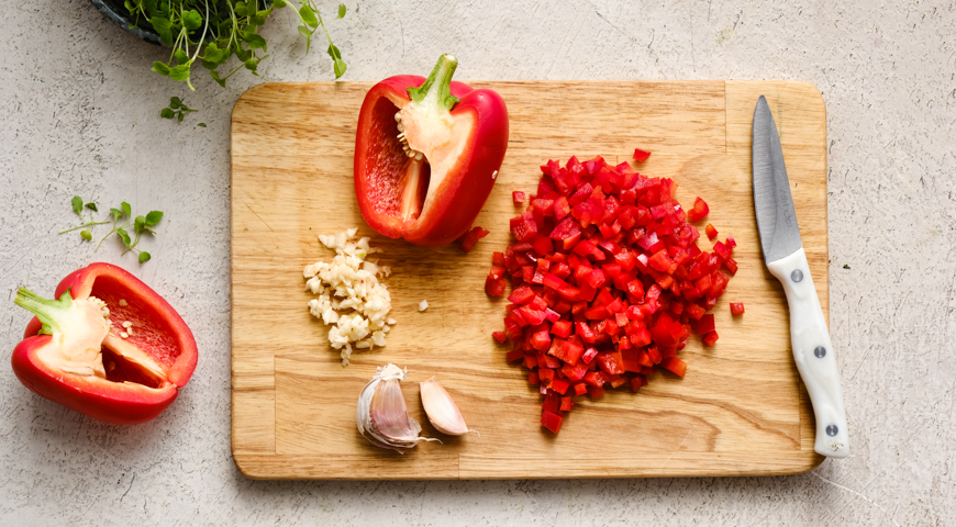 - Чеснок раздавите, очистите, мелко нарежьте. У сладкого перца удалите перегородки с семми и плодоножки. Нарежьте перцы акуратными мелкими кубиками.