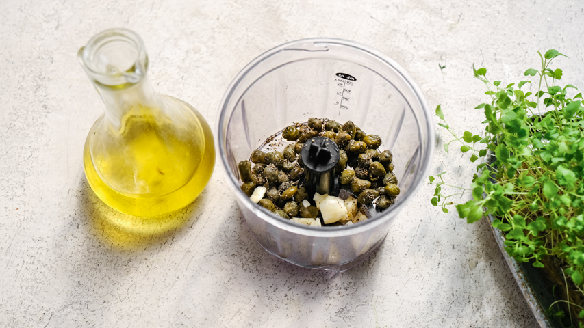Шаг 1 - Для масла чеснок раздавите, очистите и крупно порубите. Соедините в блендере чеснок, каперсы и растительное масло, добавьте черного перца и взбейте почти до однородности, пусть останутся мелкие кусочки.