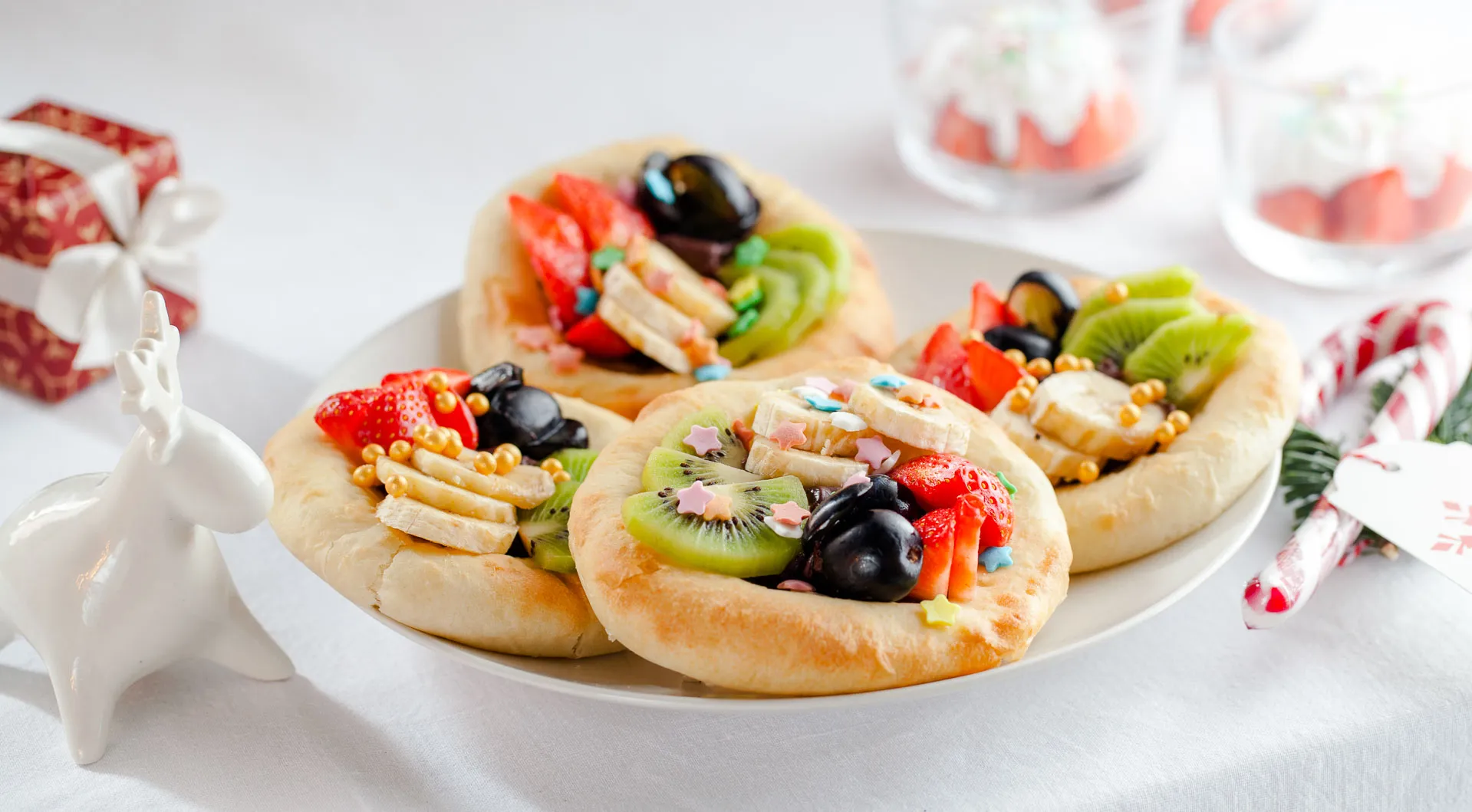 Все родители знают, что самое любимое детское блюдо — это пицца! Обычно она бывает большая и несладкая, но в новогодние праздники случаются чудеса даже с едой! Обычная пицца превращается в маленькие пицетты со сладкими начинками: фруктами, ягодами и даже сахарными драже. Так здорово, что их можно есть без ножа и вилки!