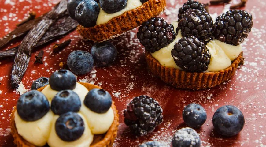 Десерт представляет собой классическое песочное печенье со сливочным кремом из маскарпоне и свежими ягодами. Идеально подходит к случаю, если к вам нагрянули неожиданные гости. В этом случае чашечки из песочного печенья, которые выпекаются очень быстро, можно заполнить мороженым или сорбетом, украсив любыми фруктами или ягодами.