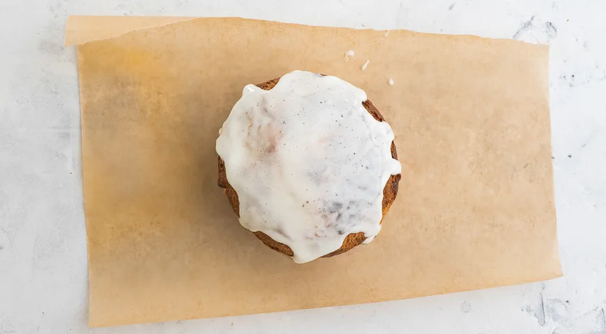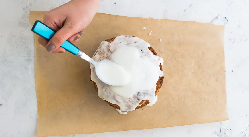 3. Оставшуюся глазурь аккуратно вылейте в цент кулича, словно выписывая небольшие круги. Глазурь должна красиво стекать по куличу вниз.