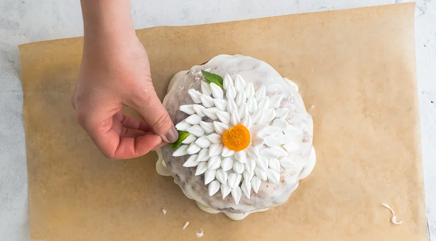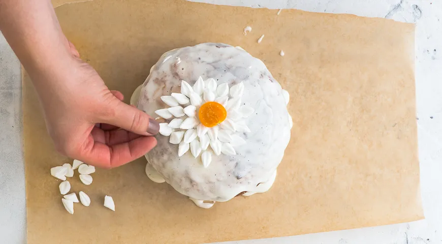 4. Пока глазурь не застыла, принимайтесь за украшения кулича. Для этого используйте пачку маршмеллоу «Мини» или «Мини белый». Из маршмеллоу получаются очень эффектные цветы. Положите половинку физалиса или сушенной вишни в центр кулича. Нарежьте маршмеллоу "Мини" по диагонали. Аккуратно выложите лепестки по кругу".
