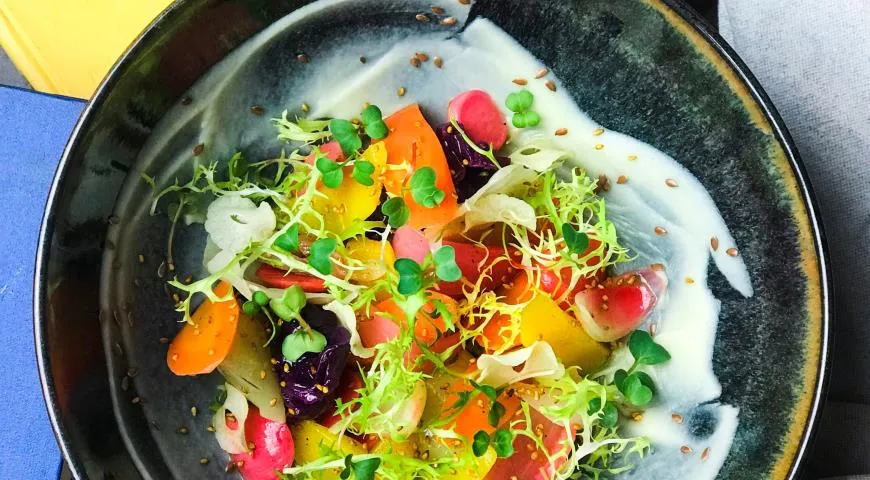 Изюминка этого салата из маринованных овощей - оригинальный соус, приготовленный из сельдерея и яблок с добавлением оливкового масла. Секрет эффектной подачи в том, что все овощи нарезаны очень тонко, но этого легко добиться при помощи специальной терки или обычного ножа для читки овощей. Идеальный салат для тех, кто придерживается принципов здорового питания в любую погоду и любое время года.