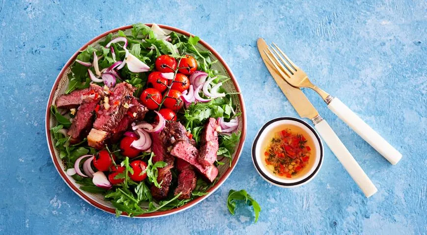 Теплый салат со стейком и помидорами