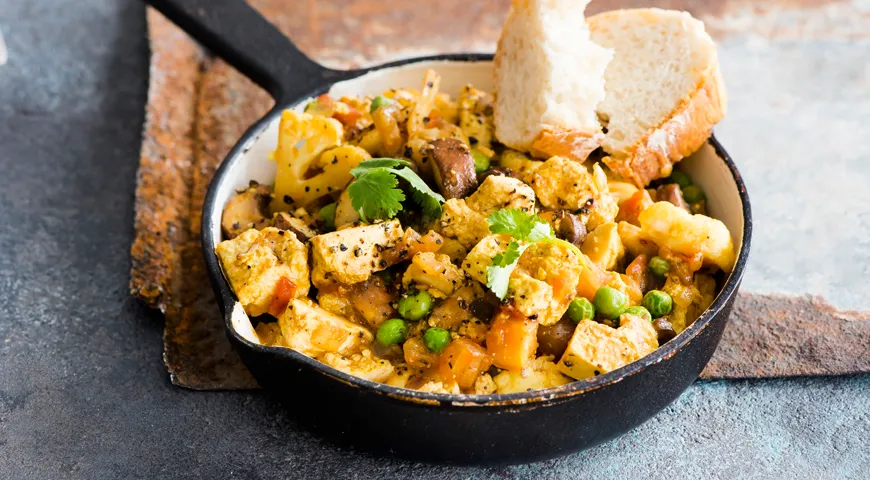 Сегодня познакомимся поближе с уникальным продуктом – тофу. Наверняка вы знаете, что тофу готовится только из растительного сырья – из сои. Его можно есть прото так, добавлять в салаты, жарить, но не все знают, что из него можно приготовить яичницу. Главное – не жалеть овощей и пряностей. На обед готовим киноа с грибами и овощами, а на ужин запекаем в духовке котлеты вместе с овощным гарниром в конверте.