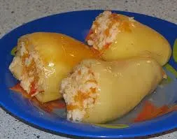 Разрежьте перец вдоль ,пополам очистите и ошпарьте. Грибы нарезанные кубиками, помидоры, чеснок, мелко рубленный лук обжарьте и добавьте по вкусу соль , молотый перец, зелень. Наполните половинки перцев приготовленным фаршем, далее...