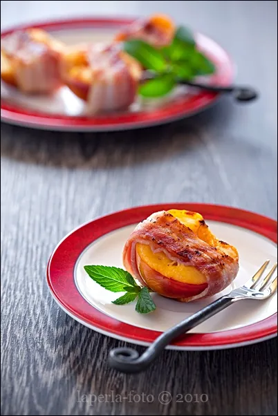 Это вкусное и очень простое в приготовлении блюдо. Таким же образом можно готовить и другие фрукты - особенно вкусными получаются не слишком сладкие нектарины, инжир, абрикосы, сливы. Сухофрукты тоже подойдут - например, крупный чернослив, курага и финики. Вместо косточки можно положить кусочек сыра. Все очень просто:) 10 персиков среднего размера 20 тонких ломтиков бекона Персики разрезать пополам, вынуть косточку. Обернуть каждую половинку персика полоской бекона. Жарить на гриле 4 минуты, перевернув один раз.