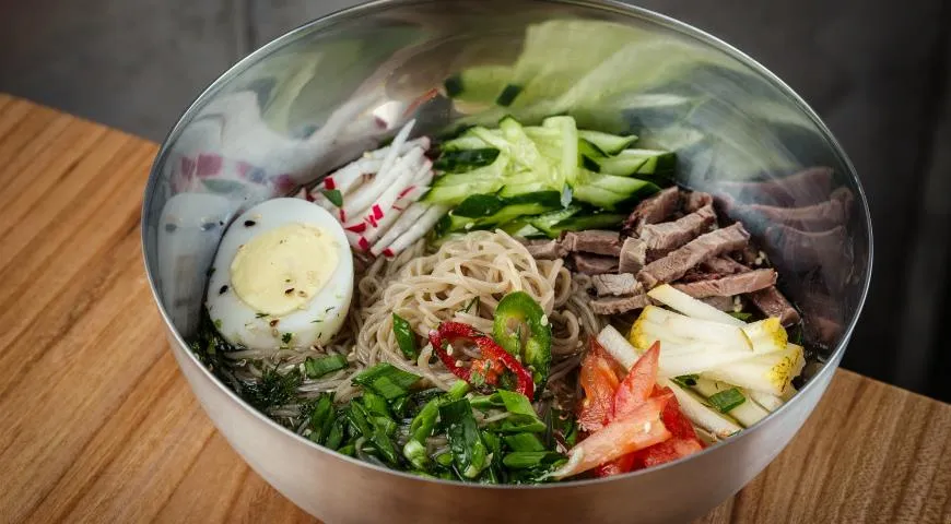 Это холодная гречневая лапша, которую подают с небольшим количеством говяжьего бульона, ломтиками вареной говядины и вареным яйцом. Отдельно к ней идут соусы: горчичный и чуть сладковатый соус из красного перца.